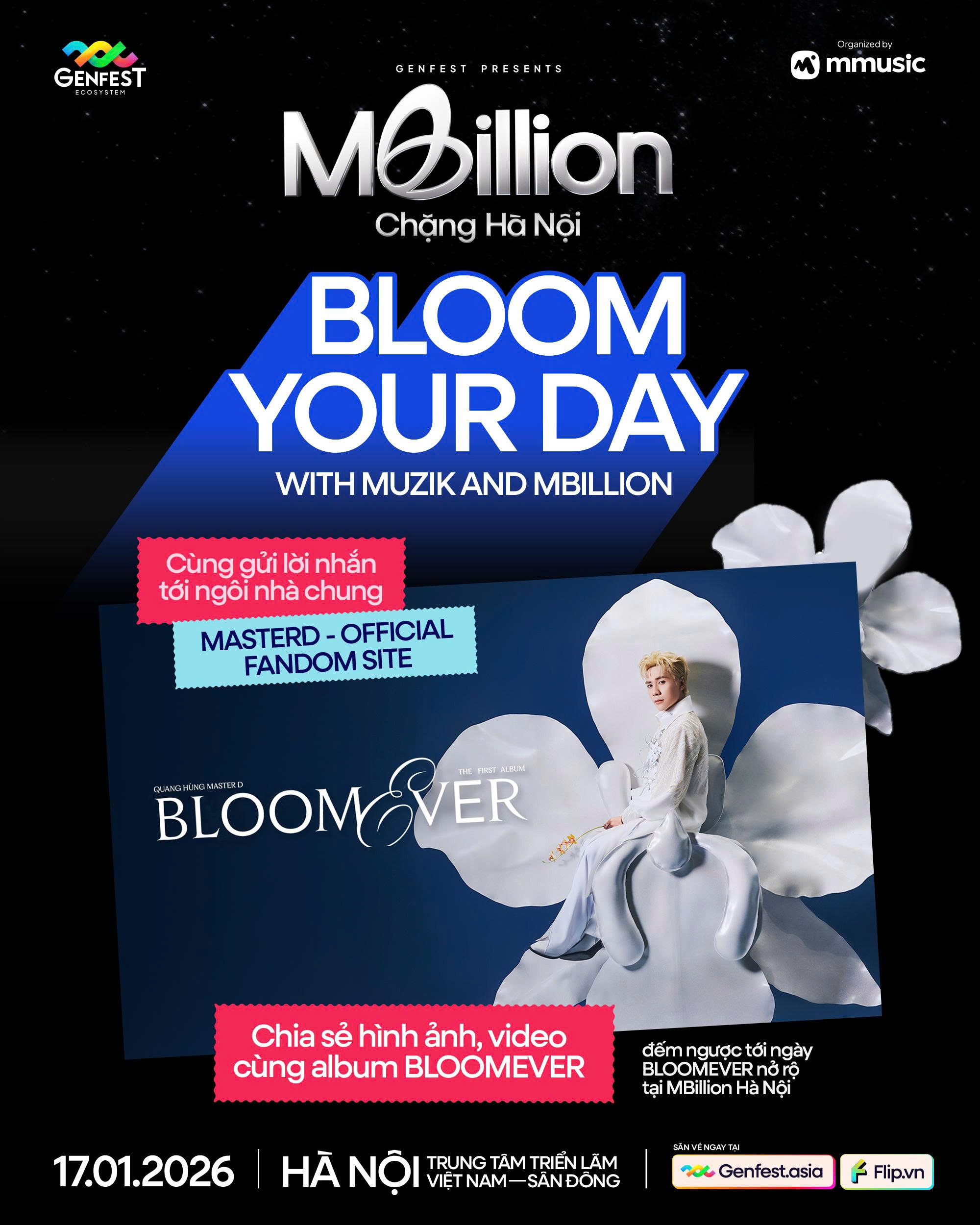 Nhân dịp Quang Hùng MasterD mang Bloomever lên sân khấu MBILLION, tụi mình muốn cùng Muzik tạo nên Vườn Hoa tại MBILLION – nơi mỗi Muzik là một bông hoa lan, nở rộ cùng album này, ở chính nơi bạn đang sống. Muzik ơi! Hãy cùng gửi lời nhắn tại ngôi nhà chung này, và làm rực sân khấu MBILLION của Tongtai nhé.